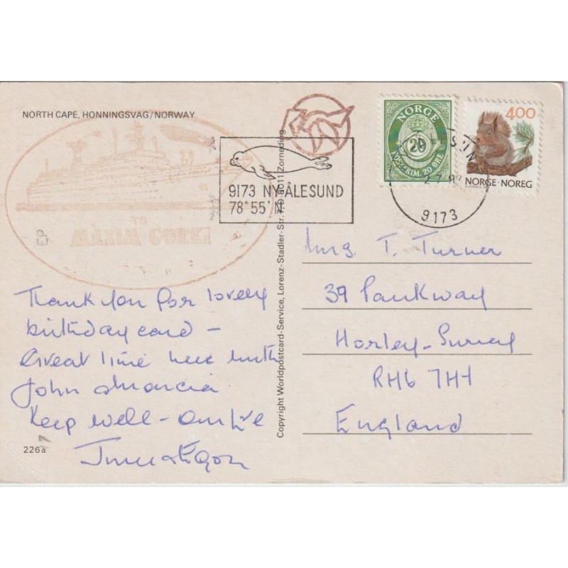 North Cape, Honningsvåg, Norway. TS Maxim Gorki. 9173 Ny Ålesund. 226a. Worldpostcard-Service. Postgått, god stand, hjørnebrett, se scans for kvalitet.