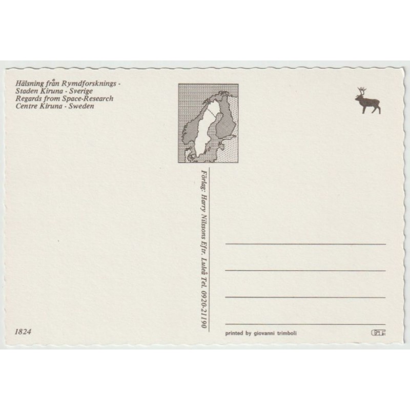 Hälsning från Rymdforsknings-Staden Kiruna, Sverige. Harry Nilssons Eftr. 1824. Ikke postgått, fin stand, se scans for kvalitet.