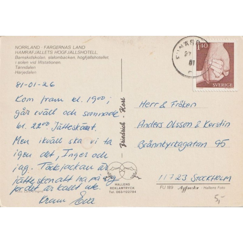 Barnskidskolan, slalombacken, högfjällshotellet, i solen vid liftstationen. Tänndalen. Härjedalen. Hallens Reklamtryck. Postgått, brukt, god stand med noe flekker, se scans for kvalitet.