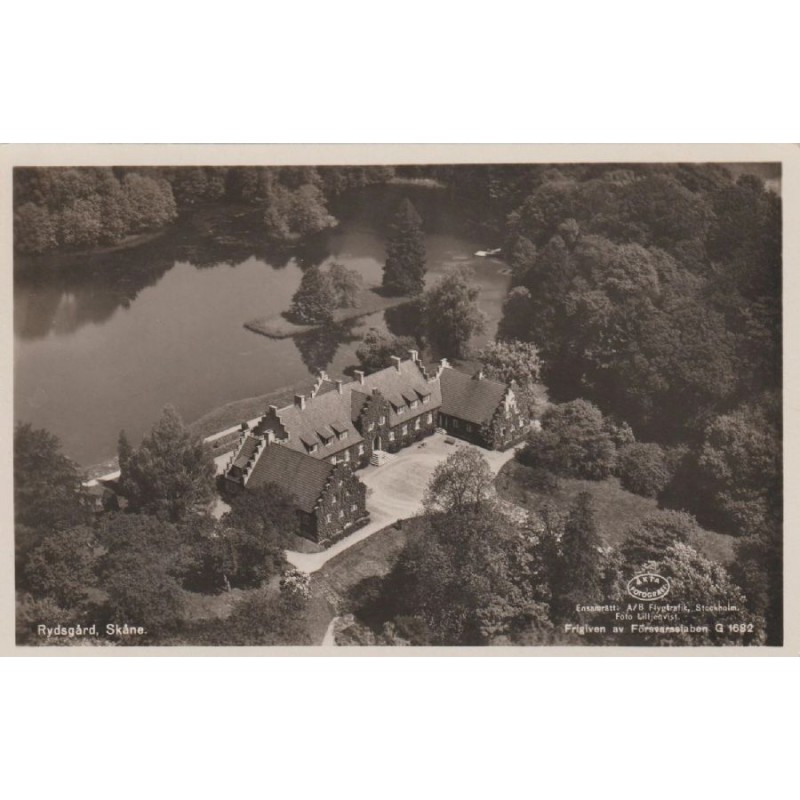 Vintage postkort med flyfoto som viser Rydsgård herregård i Skåne, Sverige. Eiendommen er omgitt av skog, hageanlegg og en stor dam med en øy. Utgitt av A/B Flygtrafik Stockholm og fotografert av Liljeqvist. Offisielt publisert av Försvarsstaben under kode G1682. Ikke postlagt, veldig god stand, se scans for kvalitet.