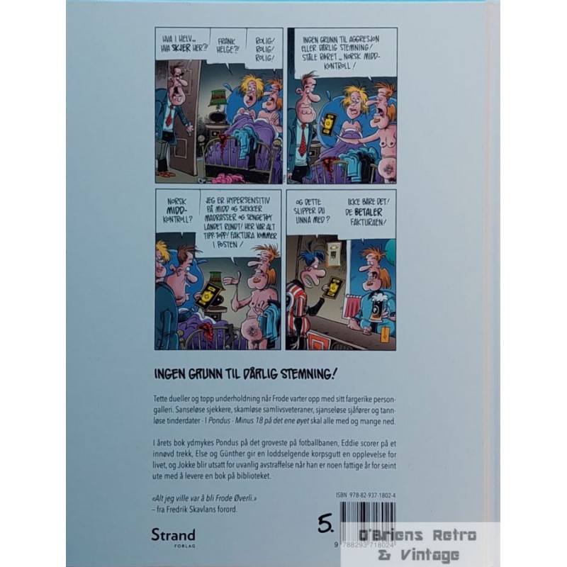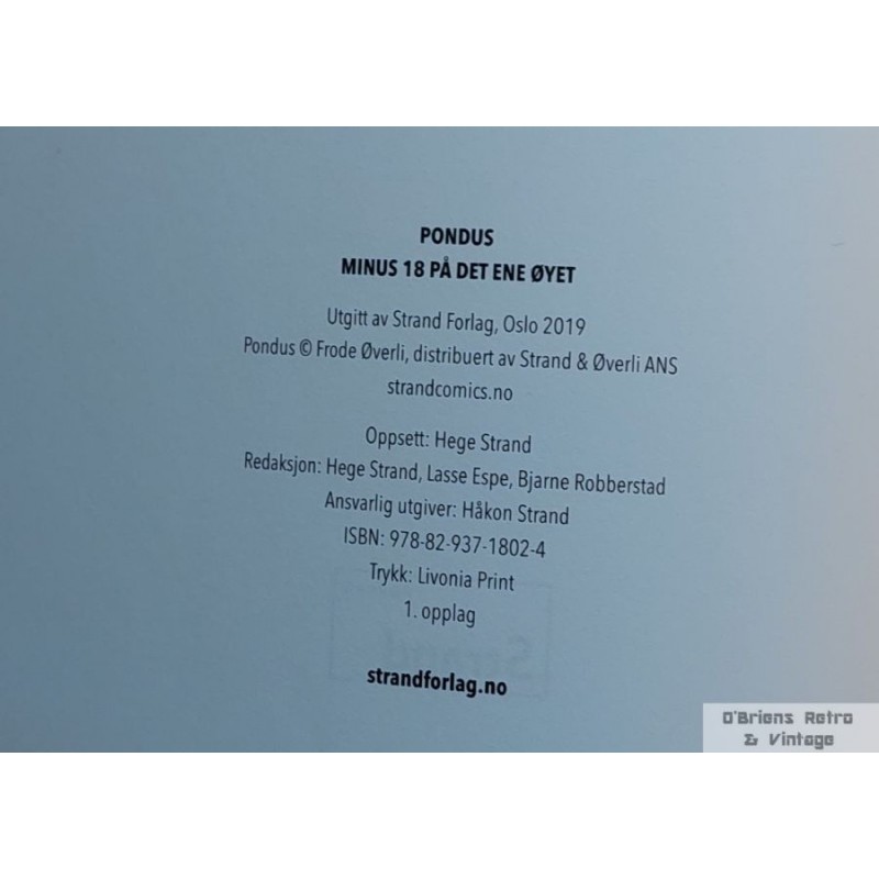 Bok nr. 2 av Pondus. Minus 18 på det ene øyet. 1. opplag, 2019. Hardcover, veldig god stand, rester etter prislapp på perm, se bilder for mer informasjon om boken. ISBN 978-82-937-1802-4.