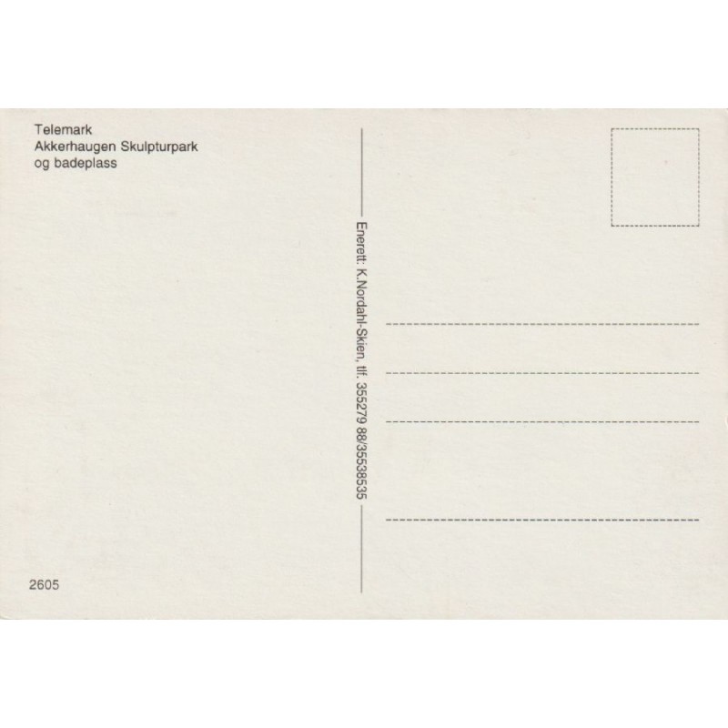 Telemark. Akkerhaugen Skulpturpark og badeplass. K. Nordahl - Skien. 2605. Ikke postgått, veldig god stand, se scans for kvalitet.