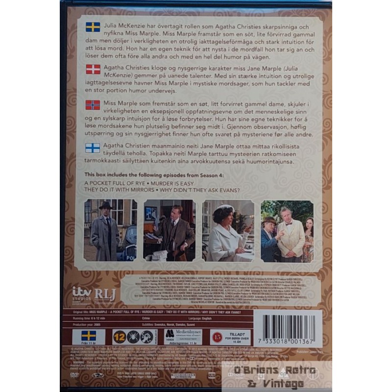 Agatha Christie - Miss Marple. Box 4. Inneholder 4 episoder. A Pocket Full of Rye, Murder is Easy, They do it with Mirrors, Why didn't they ask Evans?. Norske undertekster. Produsert i 2005. Se bilder for mer informasjon.