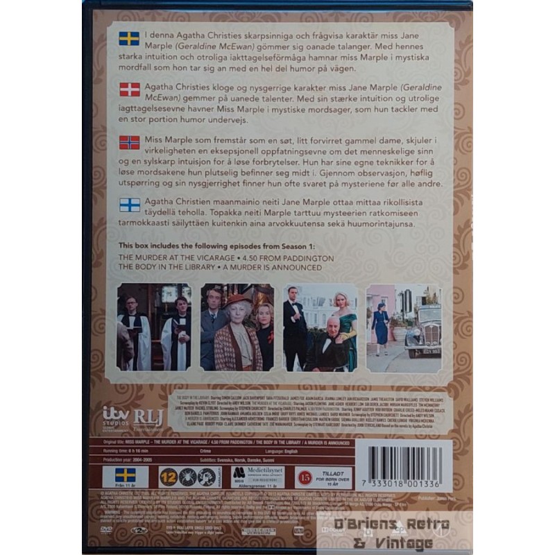 Agatha Christie - Miss Marple. Box 1. Inneholder 4 episoder. The Murder at the Vicarage, 4.50 from Paddington, The Body in the Library, A Murder is Announced. Norske undertekster. Produsert i 2004-2005. Se bilder for mer informasjon.