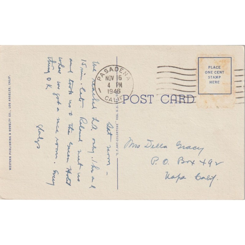 Western Publishing & Novelty. Postgått, mangler frimerker, stemplet Pasadena Nov 6 1946, i god stand, hjørnebrett, se scans for kvalitet.