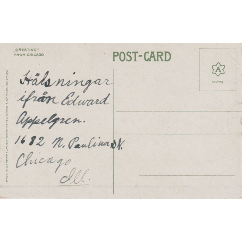 Greeting from Chicago. Made in Germany. Alsa Novitas Schwarz & Co Publ. Chicago. Ikke postgått, påskrevet, hjørnebretter, god stand, se scans for kvalitet.