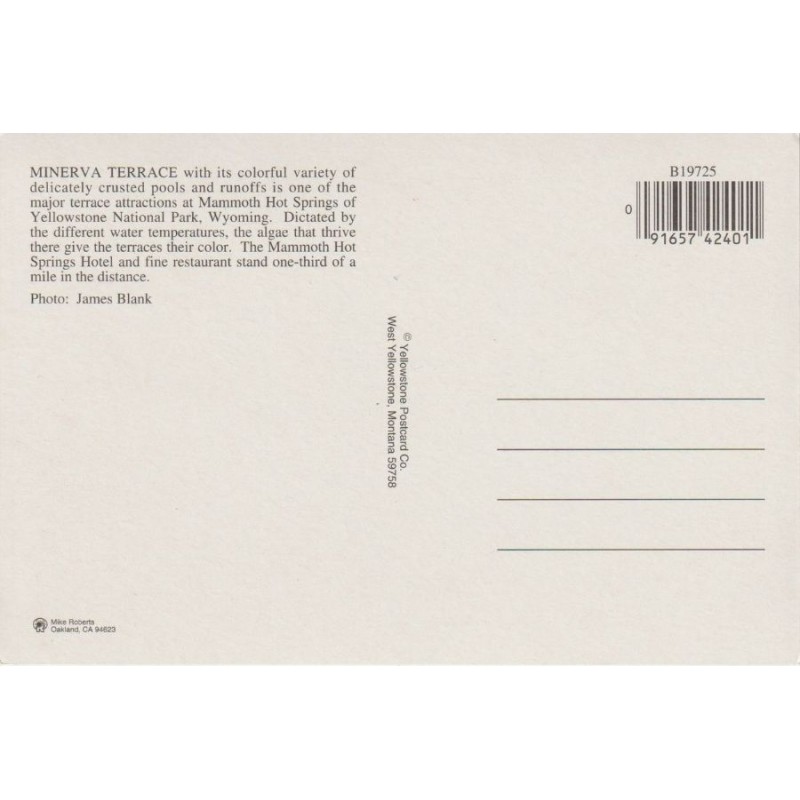 Minerva Terrace with its colorful variety of crusted pools and runoffs. Yellowstone Postcard Co. B19725. Ikke postgått, fin stand, se scans for kvalitet.