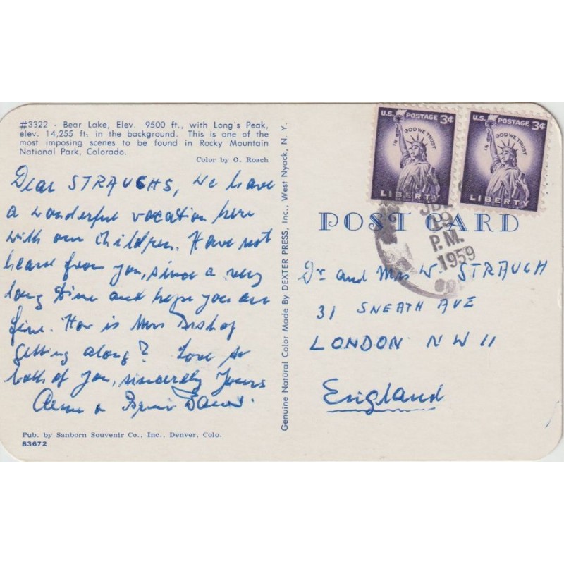 Bear Lake, Elev. 9500 ft., with Long's Peak, elev. 14,255 ftp. in the background. Color by O. Roach. Sanborn Souvenir Co., Inc. 83672. Postgått, god stand, se scans for kvalitet.